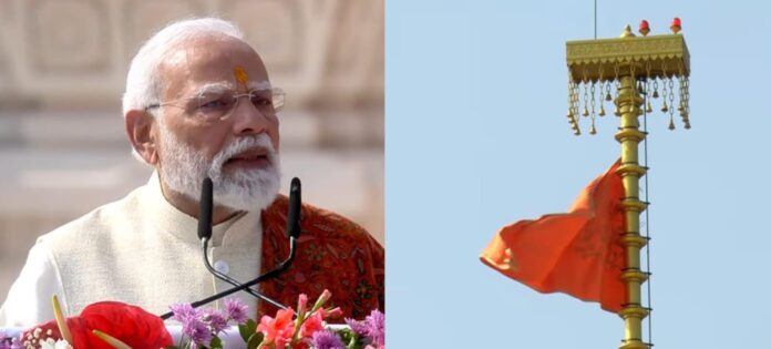 अयोध्या में राम मंदिर पर देश के प्रधानमंत्री नरेन्द्र मोदी ने अभिजीत मुहूर्त पर धर्म ध्वजा की स्थापना की, जिससे आज का दिन सनातनियों के लिए ऐतिहासिक बन गया। इसके बाद पीएम मोदी ने गणमान्य को संबोधित किया। पीएम मोदी ने कहा कि आज अयोध्या नगरी, भारत की सांस्कृतिक चेतना के एक और उत्कर्ष बिंदु की साक्षी बन रही है। हर राम भक्त के मन में आज अपार संतोष, अलौकिक प्रसन्नता है। सदियों की वेदना आज विराम पा रही है। सदियों का संकल्प आज सिद्धि को प्राप्त हो रहा है। उन्होंने कहा कि जो संकल्प एक पल को भी डिगा नहीं, एक पल को टूटा नहीं, आज धर्म ध्वजा पुनर्प्रतिष्ठापन से वह संकल्प परिपूर्ण हुआ।