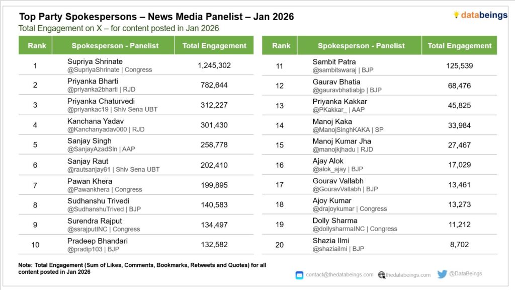 DataBeings की एक रिपोर्ट के अनुसार सोशल मीडिया प्लेटफॉर्म X पर बीजेपी के प्रवक्ताओं में प्रदीप भंडारी को देश में सबसे अधिक देखा जाता है। इस लिस्ट में प्रदीप भंडारी दसवें नंबर पर हैं। वहीं भाजपा प्रवक्ताओं में वह दूसरे नंबर पर हैं। सोशल मीडिया प्लेटफॉर्म X हो, फेसबुक हो या फिर इंस्टा हो, सभी जगह प्रदीप भंडारी की लोकप्रियता जबरदस्त है और जब वह तथ्यों से अपनी बात रखते हैं तो सभी राष्ट्रवादी लोग उन्हें सुनते हैं।